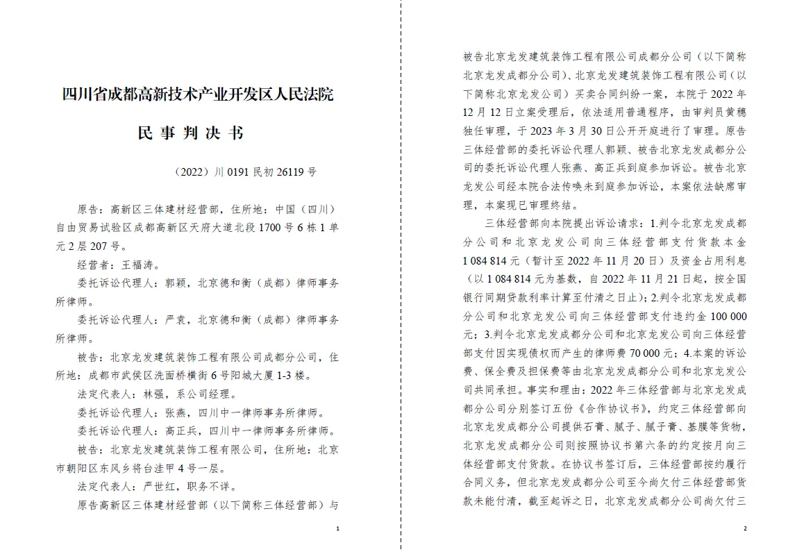 四川省成都高新技术产业开发区人民法院经过审理ღ★ღ★,做出(2022)川0191 民初26161号民事判决书ღ★ღ★,判决四川龙发在判决书生效之日起十日内向三体建材支付货款及ღ★ღ★。